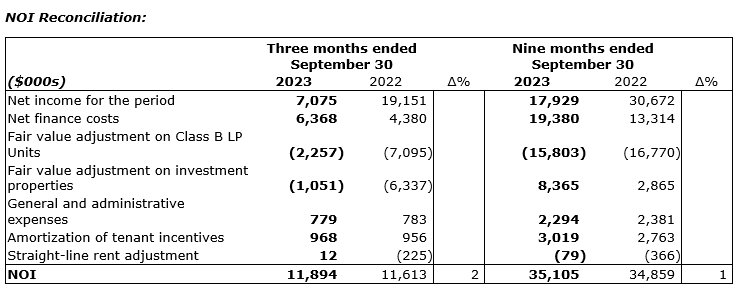 - Net operating income (NOI) was up 2 per cent at $11.89-million (Q3 2022: $11.61-million).