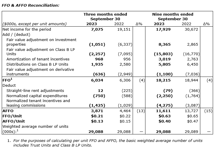 - Funds from operations (FFO) were down 4 per cent to $6.03-million or 21 cents per unit (Q3 2022: $6.31-million or 22 cents per unit).