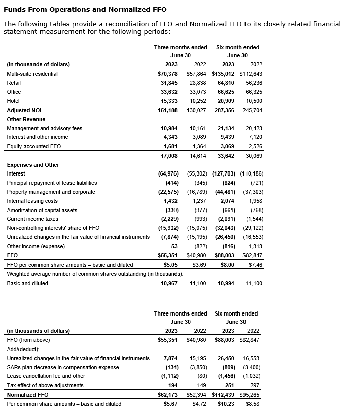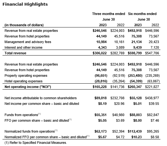 Normalized funds from operations (FFO) (1) were $62.2-million, or $5.67 per common share, for the three months ended June 30, 2023. This represents an increase of $9.8-million, or 18.7 per cent, compared with $52.4-million, or $4.72 per common share, for the same period in 2022.