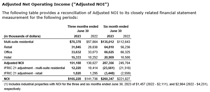 Adjusted net operating income (NOI) (1) increased by $21.2-million, or 16.3 per cent, to $151.2-million for the three months ended June 30, 2023, compared with $130.0-million for the same period in 2022.