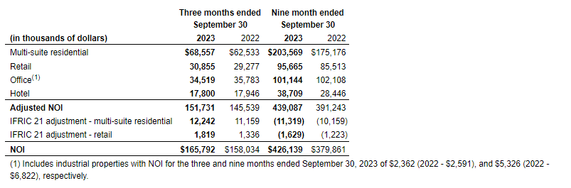 - Adjusted NOI increased by $6.2-million, or 4.3 per cent, to $151.7-million for the three months ended Sept. 30, 2023, compared with $145.5-million for the same period in 2022.