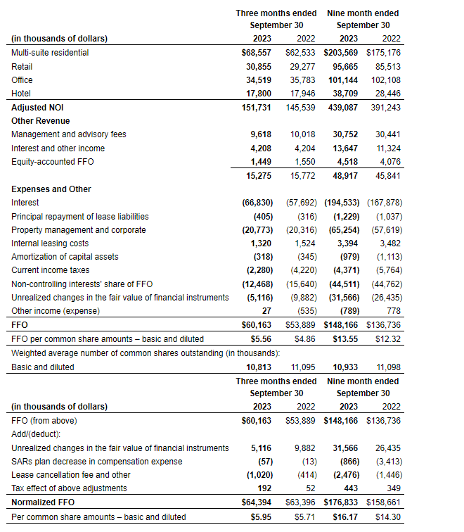 Normalized funds from operations (normalized FFO) was $64.4-million, or $5.95 per common share, for the three months ended Sept. 30, 2023. This represents an increase of $1.0-million, or 1.6 per cent, compared with $63.4-million, or $5.71 per common share, for the same period in 2022.