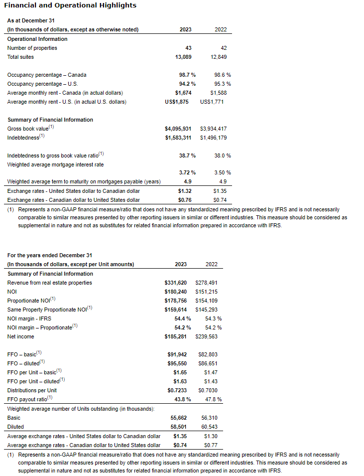 - Basic FFO of $1.65 per unit for the year ended Dec. 31, 2023, a 12.2-per-cent increase, as compared with the $1.47 per unit in 2022.