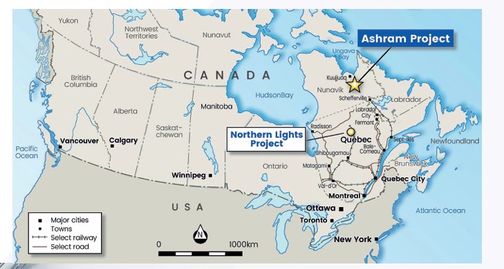 Figure 1: Ashram REE & Fluorspar Project Location and location of Northern Lights Project.