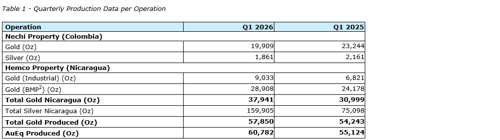 At the Nechi property in Colombia, first quarter production of 19,909 ounces is slightly lower than average but in alignment with the mining plans. Recovery to normal production levels is expected in Q3 (third quarter) 2026 as the company advances to the following areas. In parallel, the company is advancing continuous improvements to production rate and metallurgical recovery through disciplined operational execution, while formalizing additional partner operational units.