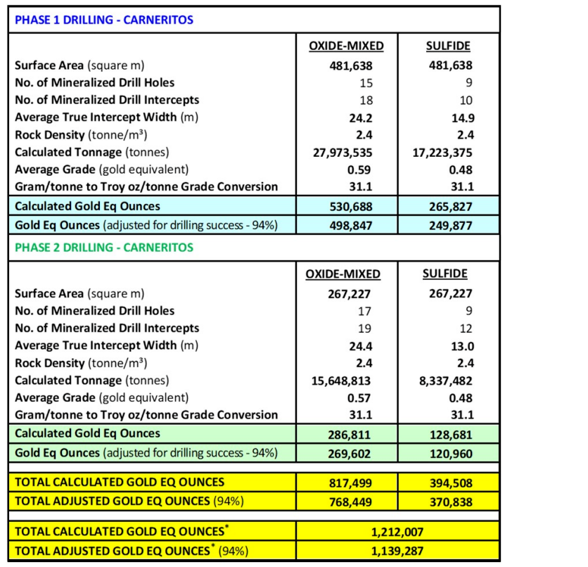 "Beyond the large 1.8 million gold equivalent target, I'm especially encouraged by the potential that more than 800,000 gold equivalent ounces could exist in the shallow oxide-mixed horizon in Carneritos. This near-surface horizon has the potential to be delineated over two phases of what should be a relatively low-cost program of only 59, approximately 50-metre-deep drill holes in the first phase, at the recommended 80-metre drill spacing. It's within this oxide-mixed mineralization that our preliminary metallurgical work suggests excellent recoveries that have the potential to be amenable to low-cost heap leach gold recovery.
