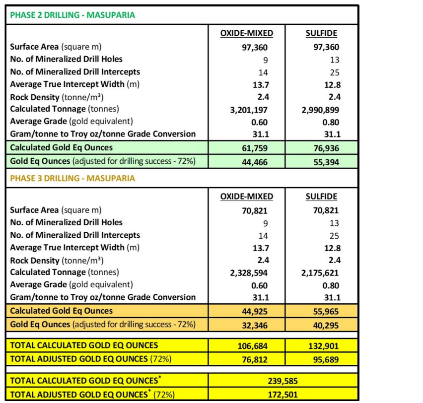 Exploration target calculation parameters -- phase 2 and phase 3 drilling, Masuparia area