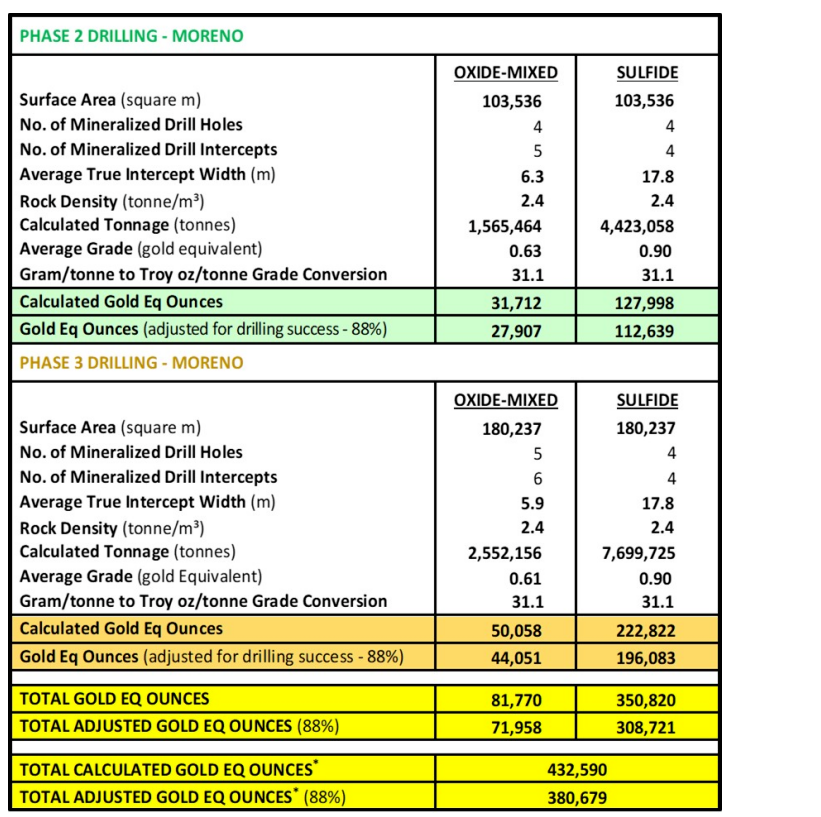 Table 3. Exploration target calculation parameters -- phase 2 and phase 3 drilling, Moreno area