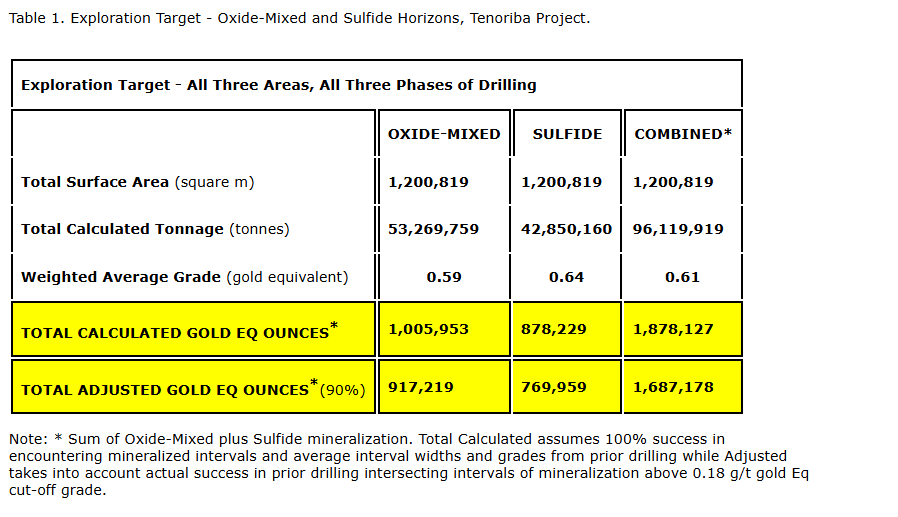 Exploration targets at Tenoriba, in both the oxide-mixed and sulphide horizons, are illustrated in Table 1.