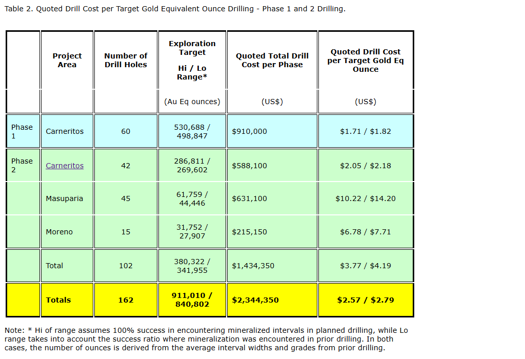 As illustrated in Table 2, the first phase of drilling in the Carneritos area, consists of 60 50 m drill holes for a total of 3,000 m drilling at a quoted cost of $910,000 (U.S.) to define the initial oxide-mixed resource with a target of 498,847 to 530,688 gold Eq ounces, or a cost of $1.82 (U.S.) to $1.71 per gold Eq ounce. Following success in the initial phase of drilling this oxide-mixed target within Carneritos a second phase of drilling is planned for a total of 102 50 m drill holes (42 additional holes in phase 2 drilling at Carneritos), at a total cost of approximately $1.5-million (U.S.) and has the potential to define a gold Eq resource target of nearly 820,000 gold Eq ounces for a combined two-phase drill cost of $1.83 (U.S.)/$2.51 per gold Eq ounce.