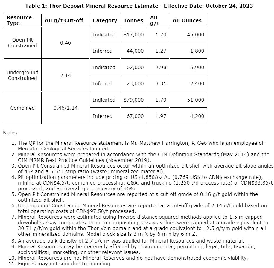 The updated mineral resource estimate for the Thor deposit comprises open-pit constrained indicated mineral resources of 817,000 tonnes at an average grade of 1.70 grams per tonne (g/t) gold for 45,000 ounces and open-pit constrained inferred mineral resources of 44,000 tonnes at an average grade of 1.27 g/t gold for 1,800 ounces at a cut-off grade of 0.46 g/t gold. The Thor deposit also includes underground constrained indicated mineral resources of 62,000 tonnes at an average grade of 2.98 g/t gold containing 5,900 ounces and underground constrained inferred mineral resources of 23,000 tonnes at an average grade of 3.31 g/t gold containing 2,400 ounces at a cut-off grade of 2.14 g/t gold (see the table entitled "Thor deposit mineral resource estimate -- effective date: Oct. 24, 2023"). The effective date of the mineral resource estimate is Oct. 24, 2023.