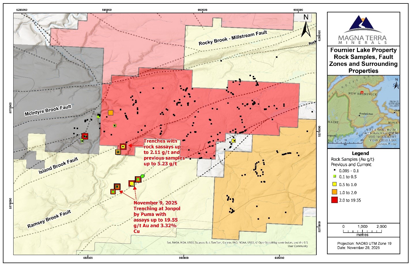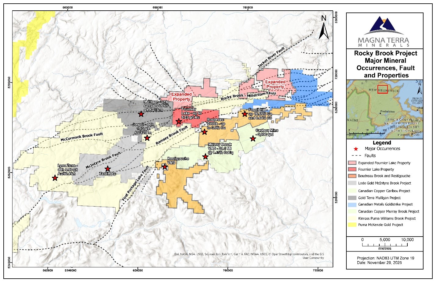 Toronto, Ontario--(Newsfile Corp. - December 1, 2025) - Magna Terra Minerals Inc. (TSXV: MTT) (the "Company" or "Magna Terra") is pleased to announce results from its initial exploration work program on the Fournier Lake Gold Property, Rocky Brook Project ("Rocky Brook" or the "Project"), located in the prolific Bathurst Mining Camp ("BMC") of northern New Brunswick (Figure 1).