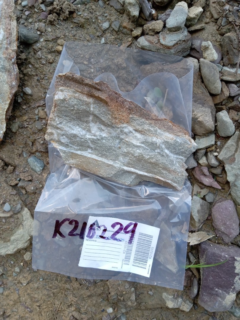 Figure 4: Field photograph of altered, quartz veined and pyrite mineralized gabbro (sample K210229) from trenches at Fournier Lake.