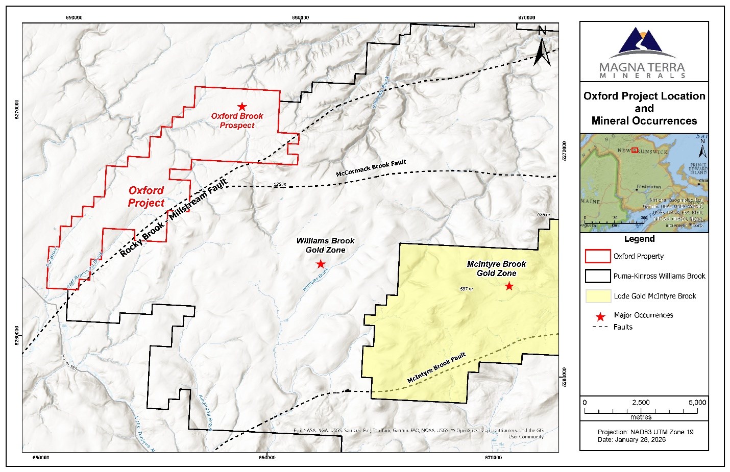 Toronto, Ontario--(Newsfile Corp. - January 29, 2026) - Magna Terra Minerals Inc. (TSXV: MTT) (the "Company" or "Magna Terra") is pleased to announce that it has acquired the Oxford Project (the "Project"), located in northern New Brunswick, via an option agreement. The Project underlying the option agreement comprises 5 mineral claims totaling 3,400 hectares that are situated along and adjacent to the Rocky Brook-Millstream Fault System (Figure 1) within the greater Bathurst Mining Camp ("BMC").