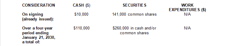 The number of common shares to be issued will be based on the greater of five cents per share or the 10-day volume weighted average price on the date a payment is due. As such, the maximum number of common shares issuable by the company with respect to the $260,000 due is 5.2 million common shares.
