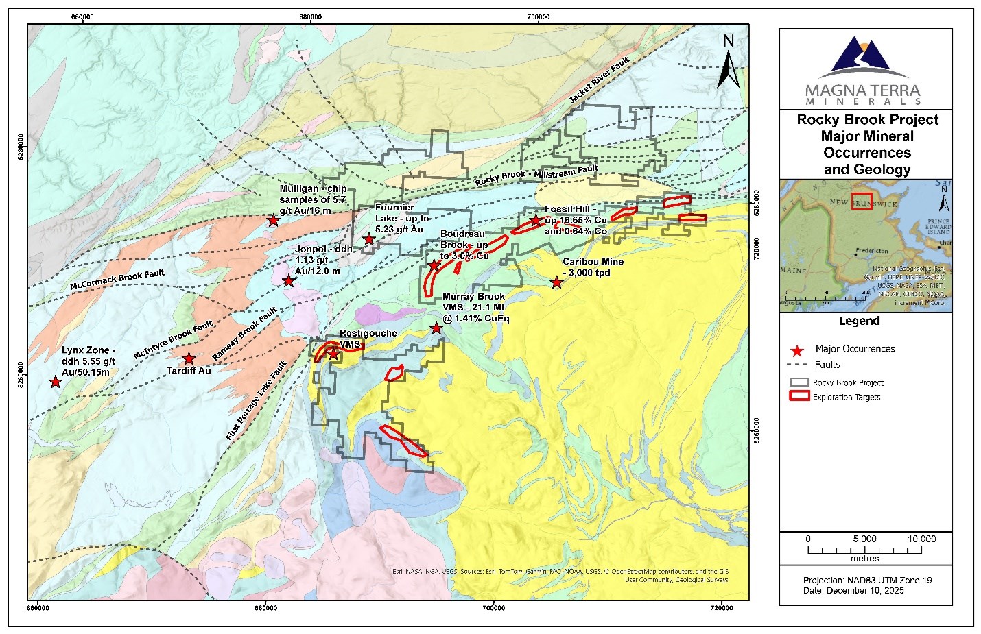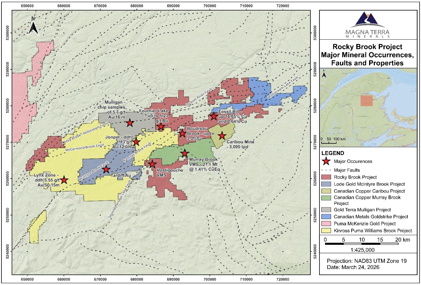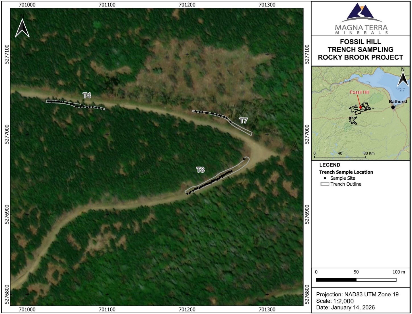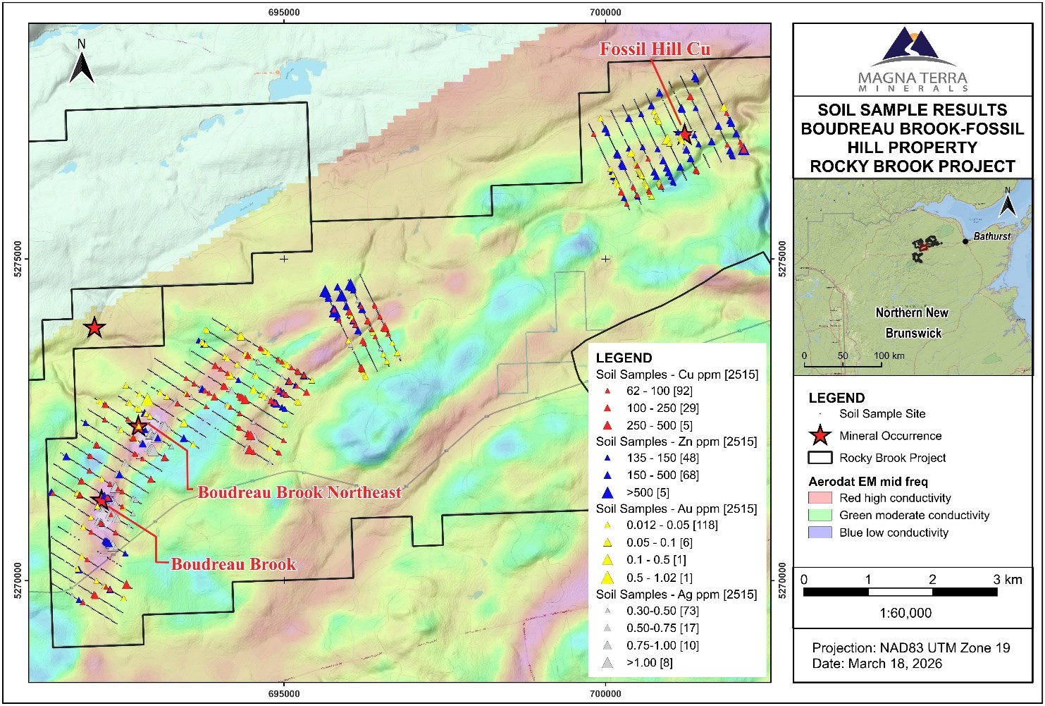 Toronto, Ontario--(Newsfile Corp. - March 25, 2026) - Magna Terra Minerals Inc. (TSXV: MTT) (the "Company" or "Magna Terra") is pleased to announce geochemical results of a soil sampling and trenching program at the Boudreau Brook-Fossil Hill Trend on its Rocky Brook Project ("Rocky Brook" or the "Project"), located in the prolific Bathurst Mining Camp ("BMC") of northern New Brunswick (Figure 1).
