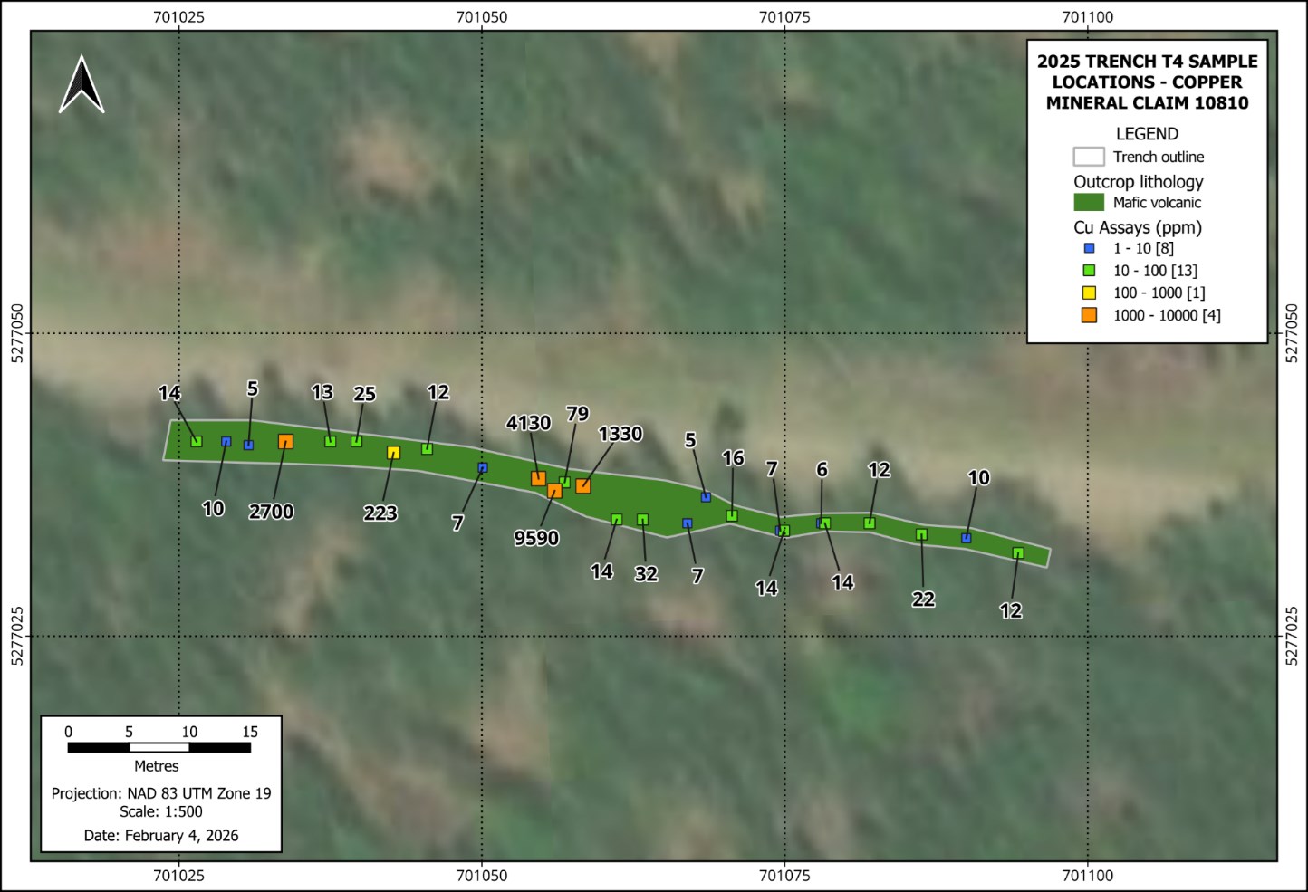 "The results of our initial trenching program on the Rocky Brook Project are very encouraging. The impressive samples of visible copper mineralization in the trenches confirms the results of historic rock grab sampling on the Project. This abbreviated trenching program testing the Fossil Hill Zone only exposes a small section of the larger Boudreau Brook-Fossil Hill Trend where previous work has outlined a 15-kilometre-long zone of coincident copper mineralized rock samples and anomalous soil samples consistent with zones of conductivity and elevated gravity. The proximity of this zone to Canadian Copper's Caribou Mill Complex adds a compelling narrative for the potential to identify and delineate additional copper-rich massive sulphide deposits well within economic trucking distance to the Caribou Mill Complex. In parallel with the trenching work at Fossil Hill, we continue to explore along the larger 15-kilometre Boudreau Brook-Fossil Hill Trend, and we are very encouraged by the results of soil sampling indicating polymetallic (Cu-Zn-Au-Ag) signatures that coincide with airborne conductors and elevated gravity signatures. In 2026, we will look to further advance this trend and other identified high priority targets throughout the Rocky Brook Project, including targets on our Restigouche Property located between 5 and 10 kilometres to the southwest of Canadian Copper's Murray Brook Deposit."