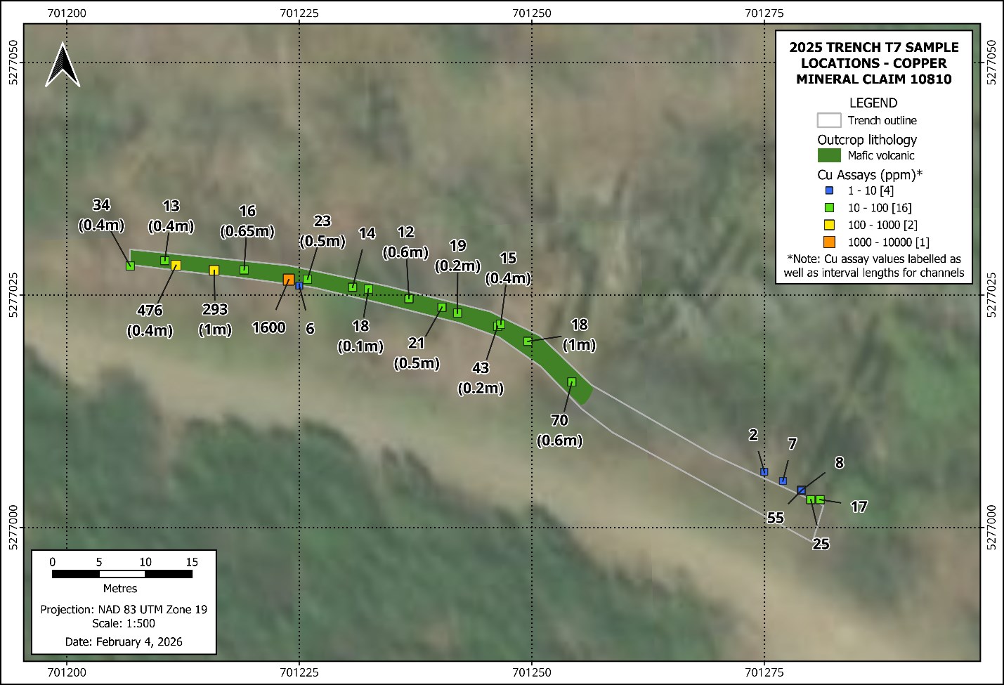 Trench T7 was 81 metres long and between 2 and 3.5 metres wide. A total of 23 rock samples (1 outcrop, 14 channel, 8 float) were collected of massive mafic volcanics and mafic volcanic breccias. Two channel and one float sample(s) of massive mafic volcanics hosted malachite along fractures. Copper assay results range between 2 to 1,600 ppm (Figure 6).