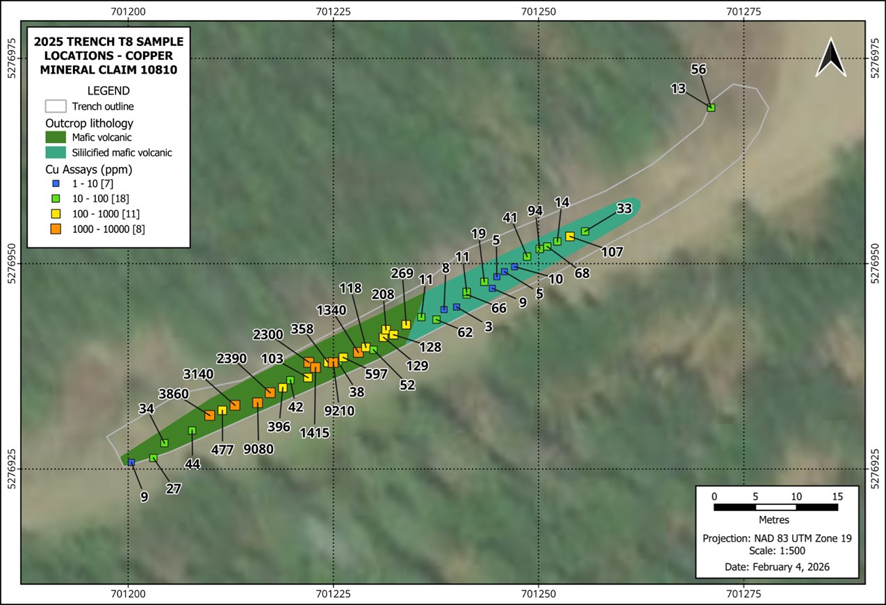 A total of three trenches (T4, T7, and T8) were excavated, totaling 245 metres in length and exposing 192 metres of bedrock, at the Fossil Hill Zone targeting areas of historical grab samples* including 16.65% and 13.84% copper and 0.64% cobalt (Figure 4). The trenches exposed massive mafic volcanic and mafic volcanic breccia rocks, locally siliceous, of the Armstrong Formation, Sormany Group. A total of 93 samples were taken including 68 grab samples* of bedrock taken at 1 to 3 metre intervals, 11 grab samples of float, and 14 channel samples ranging from 0.1 to 1.0 metres in length (Figure 4). Copper assay results range between 5 to 9,590 ppm, with three outcrop samples above 9,000 ppm Cu. Table 1 summarizes select significant sample results above 100 ppm Cu. Stripped sections of these trenches remain exposed for further mapping and sampling in the spring.