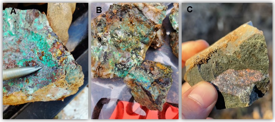 Figure 8: A) Sample H098334, 9,590 ppm Cu in Hematite-Carbonate-Epidote Mafic Volcanic Breccia with Malachite; B) Sample H098273, 9080 ppm Cu in Quartz Vein Hosting Chalcopyrite+Malachite+Azurite, and Possibly Tenorite; C) Sample H098300, 9,210 ppm Cu in Massive Mafic Volcanics with Native Copper in Quartz-Calcite Veinlet.