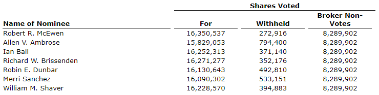 Election results for the directors nominated at the meeting are as shown in an attached table.