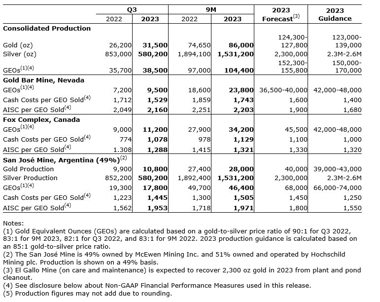 The attached table provides production and cost results for Q3 and the nine-month period in 2023 with comparative results for Q3 and the nine-month period in 2022, and McEwen Mining's forecast and guidance for 2023. McEwen Mining's forecast for 2023 reflects production to Sept. 30 and management's current estimates for Q4 2023.