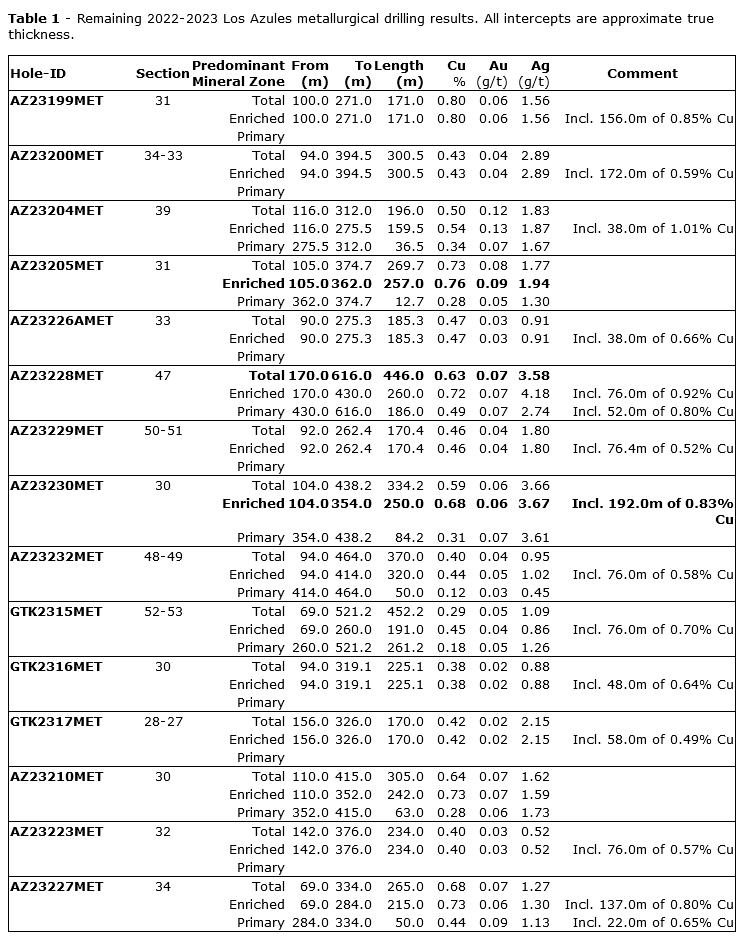 Hole AZ23230MET returned 250 m of 0.68% Cu in the Enriched zone, including 192 m of 0.83% Cu.