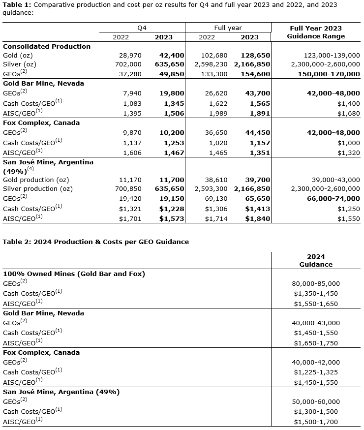 McEwen Mining Inc. has released its fourth quarter and full-year 2023 financial and operational results. (Dollar amounts are in U.S. dollars unless otherwise stated.) Net income for the year was $54.7-million or $1.15 per share versus a 2022 net loss of $81.1-million or $1.71 per share. Gold production at the Fox complex and Gold Bar mine came in just above the low end of guidance and at San Jose came in just below guidance. However, cash costs and all-in sustaining cost per ounce remain 12 to 18 per cent higher than guided and need more attention.