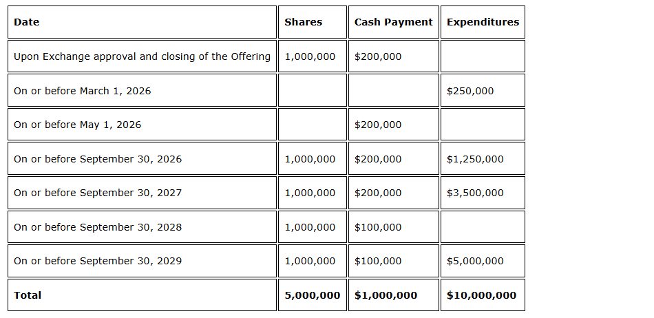 The company shall pay to Romaine annual advance royalty payments of $500,000 commencing on the earlier of i) Sept. 30, 2030, and (ii) the date a joint venture shall be deemed to have formed between Muzhu and Romaine until the date on which commercial production of the Everett property is achieved.