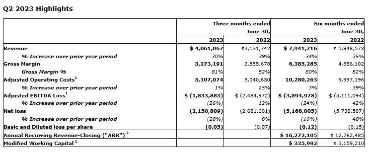 - Revenue grew to $4.06-million in second quarter 2023, up 30 per cent from $3.13-million in Q2 2022 and up 5 per cent sequentially from first quarter 2023. Revenue year to date grew to $7.94-million, up 34 per cent from $5.95-million last YTD. The increases are due to revenue growth from new customer acquisition, as well as the relative strength of the U.S. dollar to Canadian dollar.