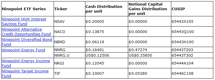 Ninepoint Partners LP has declared the final December, 2023, cash and annual notional capital gains distributions for its ETF (exchange-traded fund) series securities. The record date for the distributions is Dec. 28, 2023, for Ninepoint High Interest Savings Fund, and Dec. 29, 2023, for Ninepoint Alternative Credit Opportunities Fund, Ninepoint Energy Fund, Ninepoint Energy Income Fund, Ninepoint Diversified Bond Fund and Ninepoint Target Income Fund. All distributions are payable on Jan. 8, 2024.
