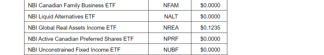 An attached table lists all NBI ETFs and the amounts of per-unit reinvested distributions.