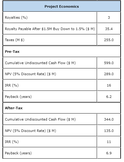 The economic results of the PEA are summarized herein on an after-tax basis. The sensitivities and the impact of cash flows have been calculated for plus or minus 20-per-cent variations against the base case.
