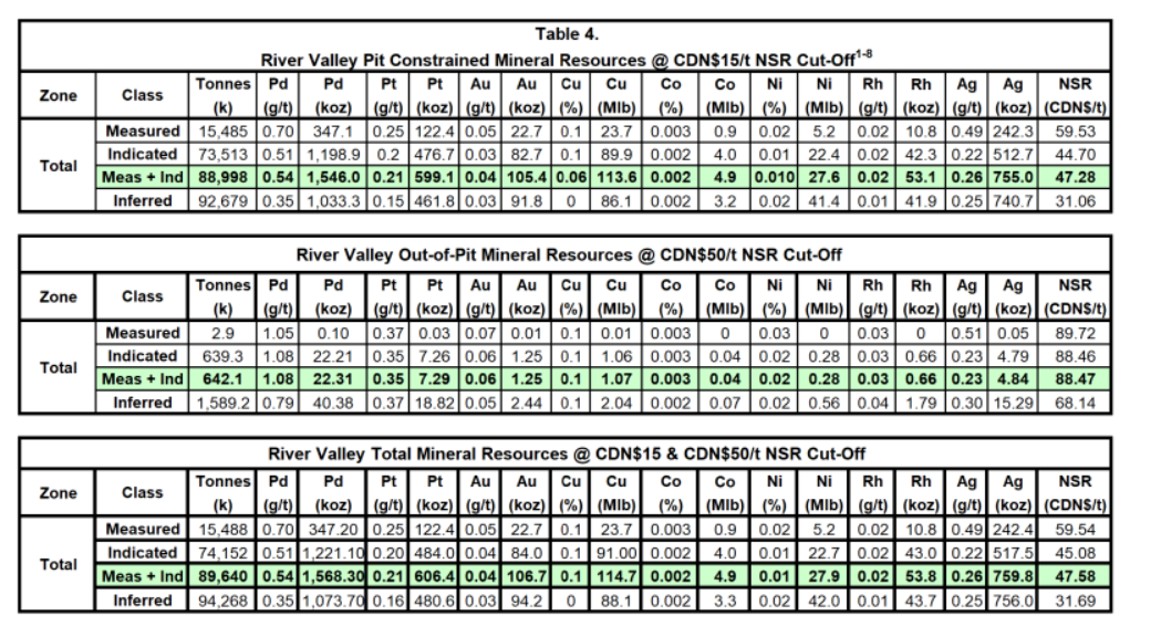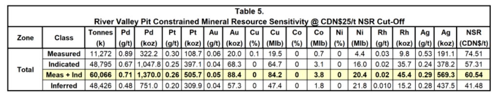 The details of the 2021 updated mineral resource estimate were announced in a company press release dated Oct. 5, 2021. The effective date of the updated mineral resource estimate is Sept. 14, 2021. At cut-offs of $15/t net smelter return (pit constrained) and $50/t NSR (out-of-pit), the mineral resource estimate consists of: 89.9 Mt grading 0.54 g/t Pd, 0.21 g/t Pt, 0.04 g/t Au and 0.06 per cent Cu, or $47.58/t NSR in the measured and indicated classifications; and 94 Mt grading 0.35 g/t Pd, 0.16 g/t Pt, 0.04 g/t Au and 0.06 per cent Cu, or $31.69/t NSR in the inferred classification. Contained metal