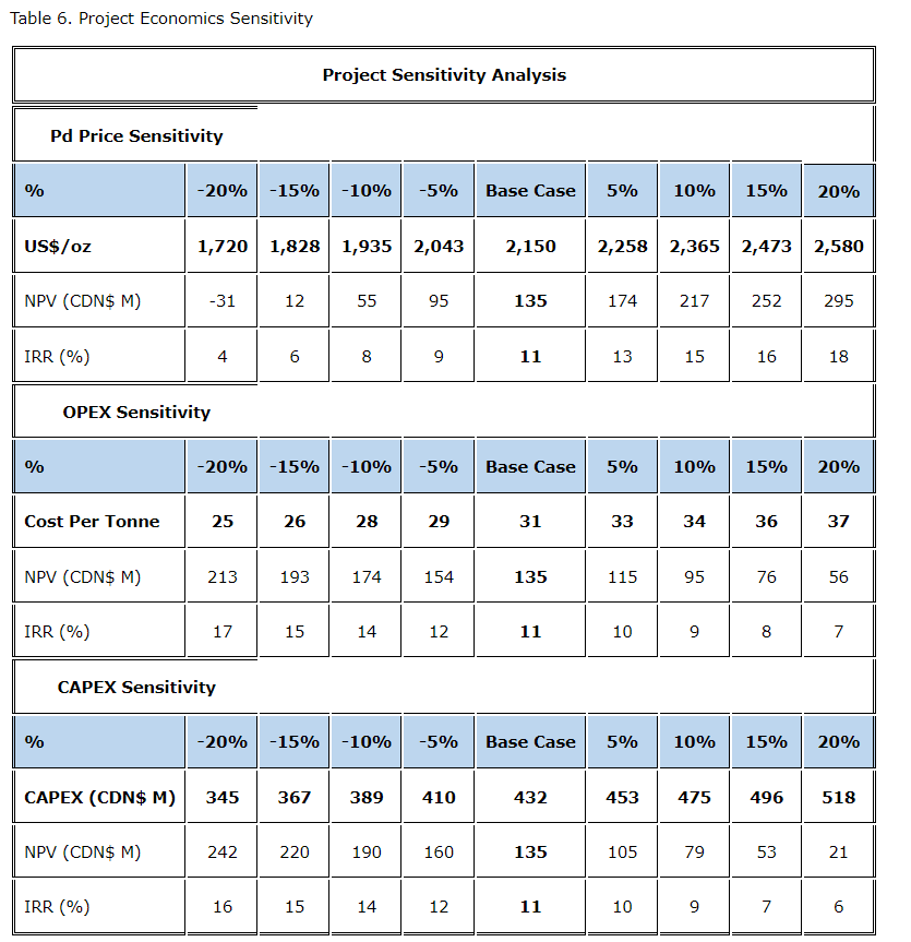 The project is sensitive to Pd recovery. A 20-per-cent increase in Pd recovery, possibly resulting from hydrometallurgical treatment, results in an increased after-tax (5-per-cent discount rate) NPV of $250-million and an after-tax IRR of 16 per cent.