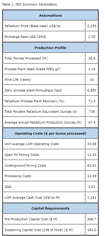2.5 million tonnes (Mt) of potential process plant feed at an average grade of 1.19 grams per tonne palladium equivalent and process recovery of 71.5 per cent, resulting in an average annual payable Pd production of 47,400 ounces;