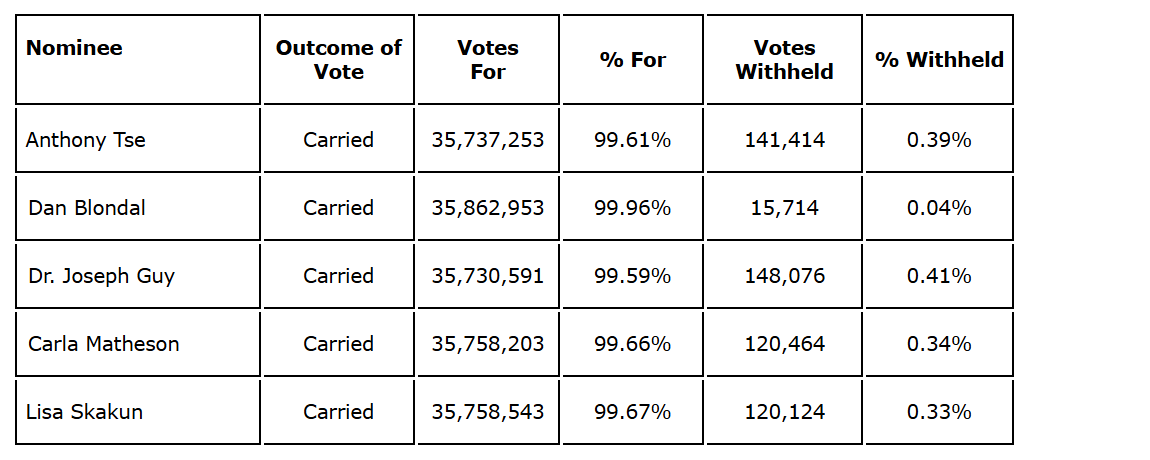 Detailed voting results for each of the matters voted on at the meeting will be available for viewing on the company's website and on SEDAR+.