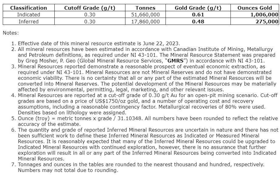 Details of the MRE are provided in a technical report entitled "Technical Report on the Nutmeg Gold Property," with an effective date of June 22, 2023, prepared in accordance with National Instrument 43-101 standards, which is filed under the company's SEDAR+ profile.