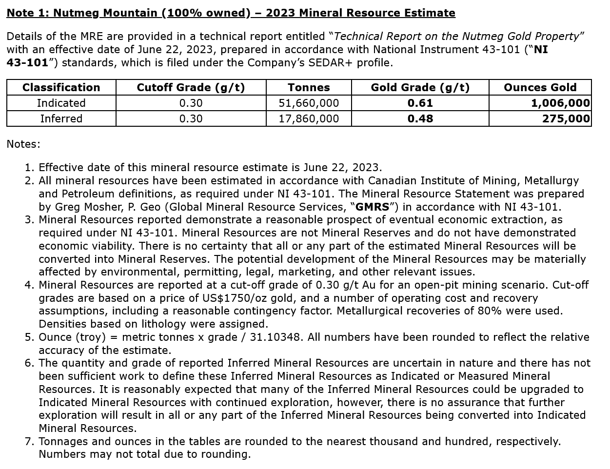In January 2024, Nevgold exercised its option to acquire 100% of the Nutmeg Mountain Gold Project in Washington County, Idaho. Previously, on August 17, 2023, Nevgold announced a Mineral Resource Estimate at Nutmeg of 1,007,000 Indicated ounces of gold (51.7 Mt @ 0.6 g/t Au), and 275,000 Inferred ounces of gold (17.9 Mt @ 0.48 g/t Au) (see Note 1).