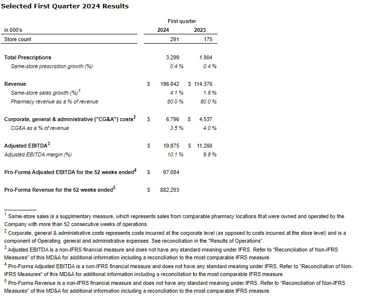 Successfully closed on two previously announced acquisitions, completed in late June, 2023, bringing pharmacy network to 291 locations across Canada.