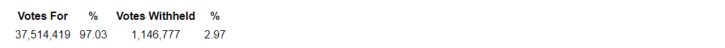 The seven nominees for election as directors proposed by management of the company were elected by a majority of votes cast by the shareholders present or represented by proxy at the meeting. The voting results for each nominee are provided in an attached table.