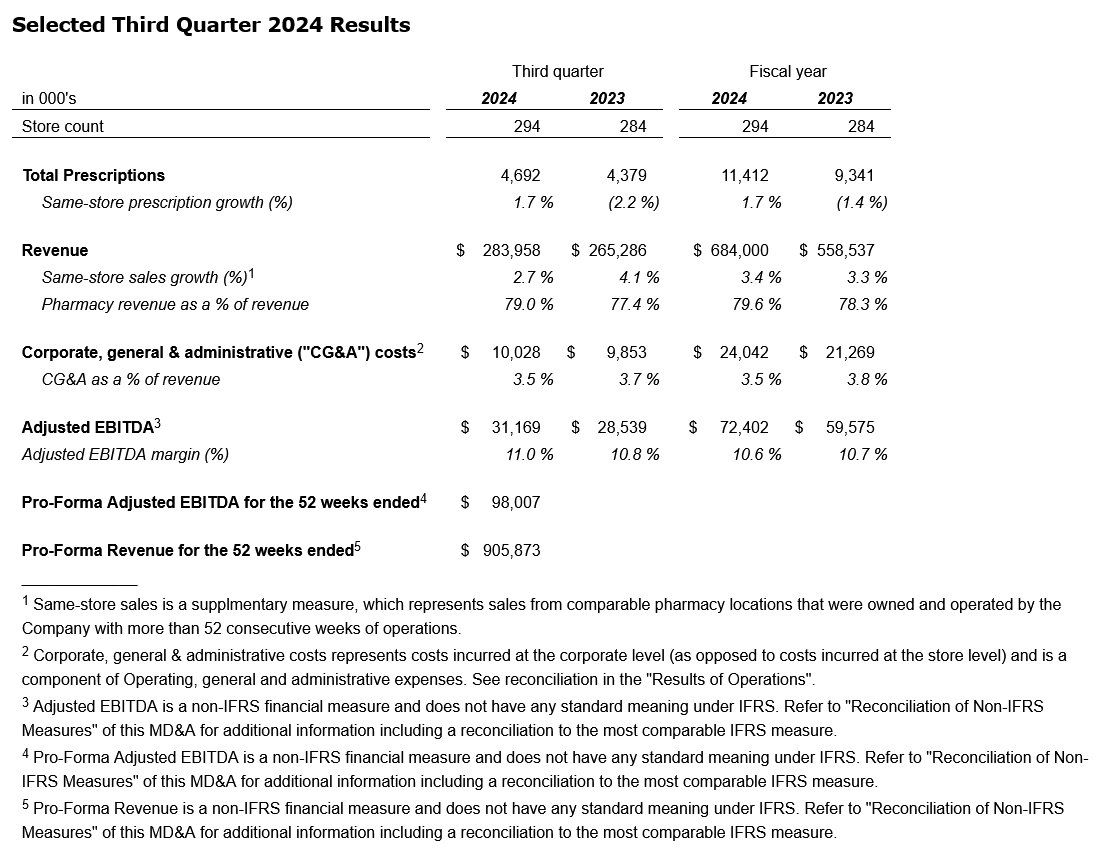 The Company acquired two pharmacy locations subsequent to the second quarter's earnings release, bringing the pharmacy network to 294 locations across Canada.