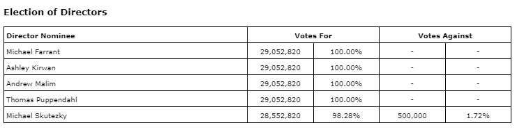 A total of 29,052,820 common shares were represented in person or by proxy at the 2023 AGM, representing 61.07 per cent of the company's outstanding common shares as at the record date of July 24, 2023. Shareholders voted in favour of all matters brought before the meeting. All five director nominees listed in the company's management information circular dated July 24, 2023, were re-elected as shown in an attached table.