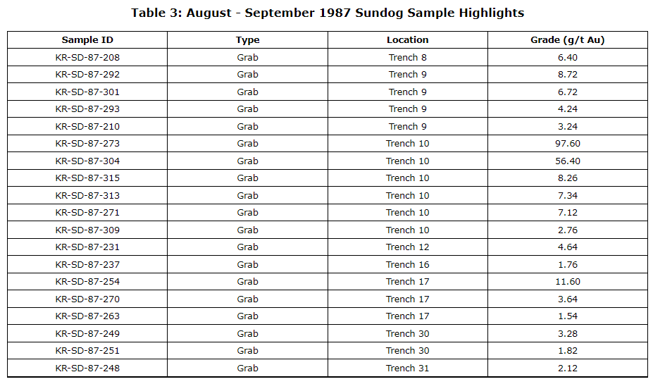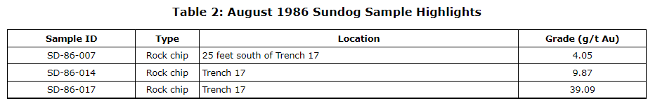 In his June, 1986, trip to Sundog, Mr. Reading took nine grab samples, six from the Trench 10 area and three from the Trench 29 area, with the best assay being 62.8 g/t Au. In August, 1986, Mr. Reading collected a further 26 rock chip and 13 panned concentrate (PC) samples from trenches 17 and 29 areas, with most taken from the Trench 17 area. PC samples included 206.7 g/t Au from the Trench 17 area and 127.6 g/t Au from the Trench 29 area. The rock chip sample highlights are shown in the table entitled "August, 1986, Sundog sample Highlights."