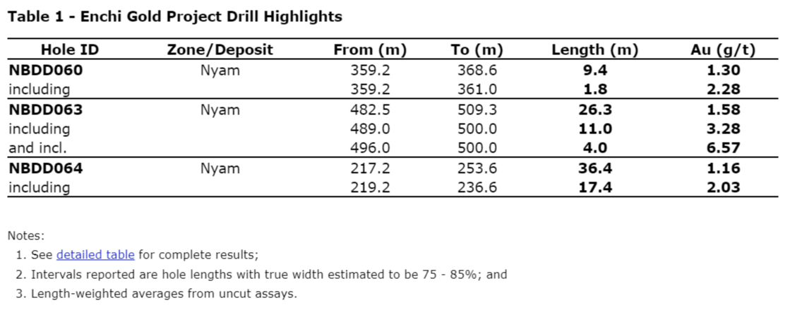 Greg Smith, VP Exploration of Newcore stated, "This latest drilling at our Enchi Gold Project continues to prove out our geological model that includes resource growth from the higher-grade mineralization at depth. Drilling followed-up on two previously identified high-grade shoots at Nyam, which remain open to depth and along strike, and highlight the resource growth potential of the high-grade mineralization in the sulphides. We continue to advance our understanding of the significant size and scale potential at Enchi, which is located on a prolific gold belt in southwest Ghana that hosts a number of multi-million-ounce gold mines."