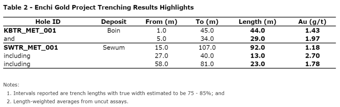 Additional exploration work underway at Enchi includes trenching on several kilometre-scale gold anomalies which continues to advance early-stage targets towards the drill testing stage, and further metallurgical testwork of both the oxide and sulphide mineralization.
