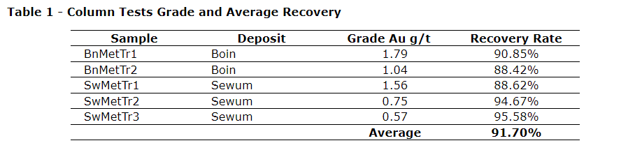A total of five column tests (three from Sewum and two from Boin) returned an average gold recovery of 91.7 per cent, with a recovery range of 88.4 per cent to 95.6 per cent.