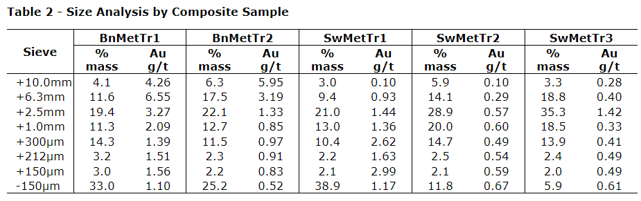 For composite BnMetTr1, 66.4 per cent of the gold was recovered on the first day, with recoveries increasing consistently to 83.6 per cent on the 10th day. For composite BnMetTr2, 66 per cent of the gold was recovered on the first day, with recoveries increasing consistently to 81.6 per cent on the 10th day. For composite SwMetTr1, 74.6 per cent of the gold was recovered on the first day, with recoveries increasing consistently to 87.6 per cent on the 10th day. For composite SwMetTr2, 77.8 per cent of the gold was recovered on the first day, completed testing at 89.5 per cent on the 10th day. For composite SwMetTr3, 66.4 per cent of the gold was recovered on the first day, with a final recovery of 90.3 per cent on the 10th day. In all cases, leaching continued after the first 10 days with ultimate recoveries expected to continue to increase with additional leaching time.
