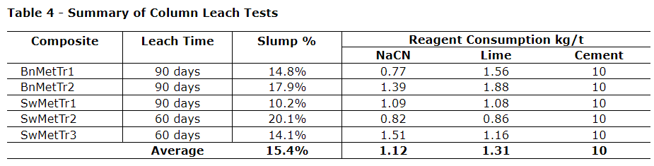 All samples showed modest cyanide consumption with an average of 1.2 kilograms per tonne (kg/t), with a 1.3 kg/t lime (hydrated) addition to maintain a pH above 10.5.