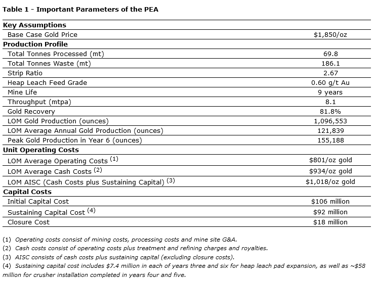 Cash costs are reflective of the cost of production. Cash costs reported in the PEA consist of mining costs, processing costs, mine site G&A, treatment and refining charges and royalties. Cash costs per ounce is calculated as cash costs divided by payable gold ounces.